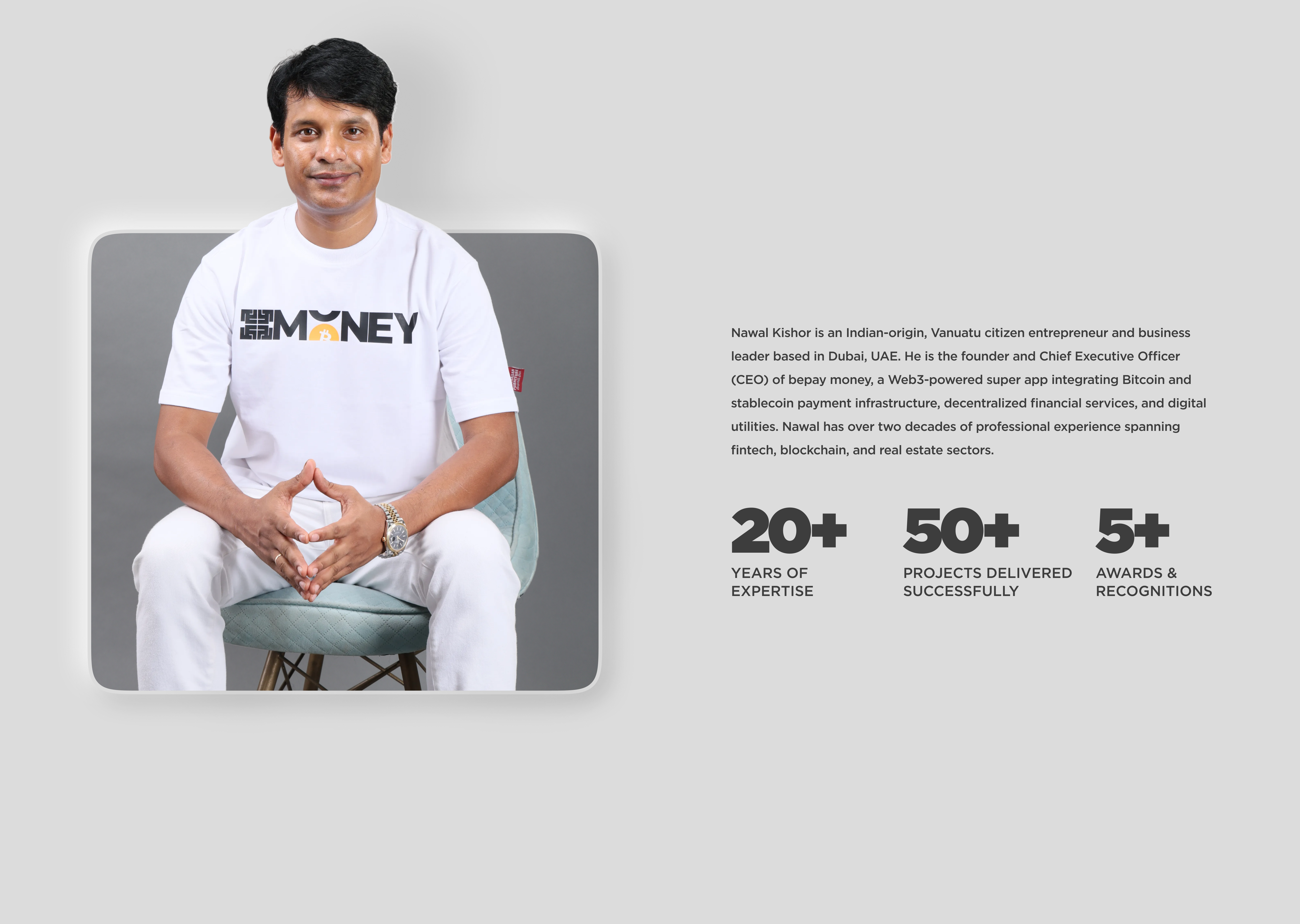 Nawal Kishor is an Indian-origin, Vanuatu citizen entrepreneur and business leader based in Dubai, UAE. He is the founder and Chief Executive Officer (CEO) of bepay money, a Web3-powered super app integrating Bitcoin and stablecoin payment infrastructure, decentralized financial services, and digital utilities. Nawal has over two decades of professional experience spanning fintech, blockchain, and real estate sectors.